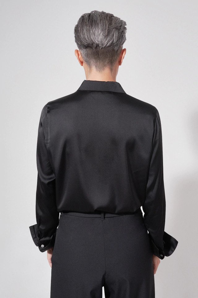 Camisa de calce relajado confeccionada en seda sintética. Presenta un cuello clásico con botón metálico de strass. Acceso por cartera central delantera invisible con botones de pasta. Posee mangas largas con puños anchos y tajos laterales que se unen por dobles botones metálicos de strass a presión.