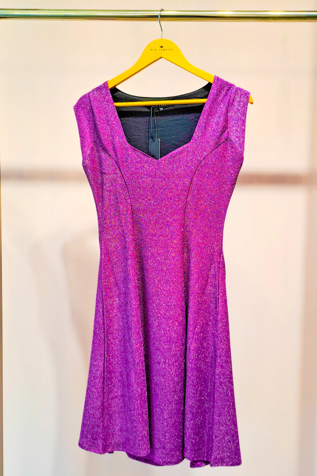 Vestido de falda evasé y escote corazón, con mangas cortas y busto forrado. Confeccionado en lúrex de alta torsión, aporta sensualidad, movimiento y brillo, perfecto para realzar tu estilo en eventos únicos.