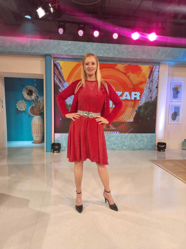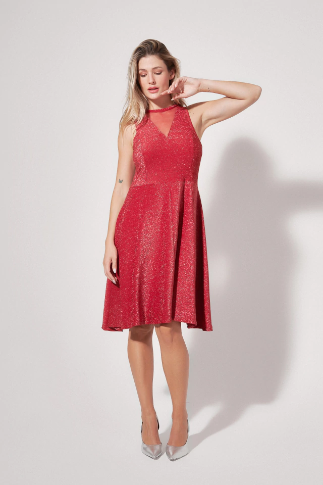Vestido de falda evasé sin mangas con recortes de entalle en cintura, confeccionado en alta torsión lúrex. Posee cuello redondo con recorte en v de micro tul. Sensualidad, movimiento y brillo definen a este vestido ideal para lucir en fiesta, coctel o evento.