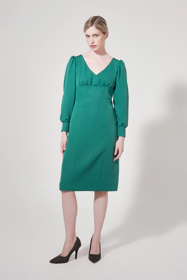 Vestido de crepe sastrero de mangas largas con puños de doble botón metálico volcado a tono y escote en V, con recorte y frunce en bajo busto. Forrería de punto para mayor confort y acceso por cierre trasero a tono.